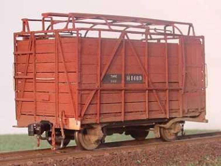 H-8 4 wheel Cattle wagon. 8'6" wheel base. 79 wagons built in 1937 to 40. Av tare 6-19-0. Numbers 750 to 820, 866 to 877. Pewter, brass and styrene parts. Northyard wheels and bearings. No couplers. |